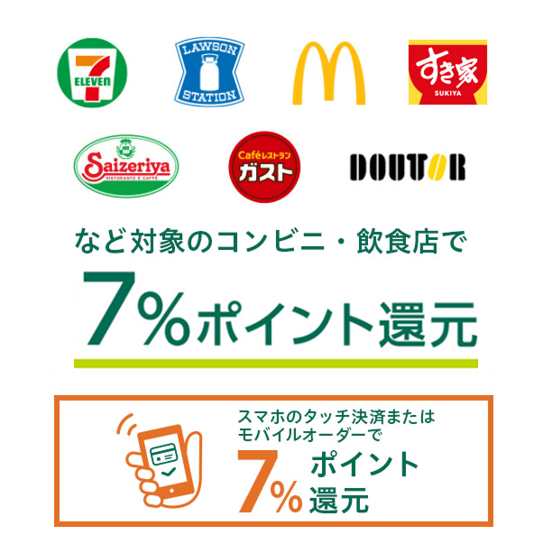 - マクドナルド・吉野家・はま寿司などで7%還元
